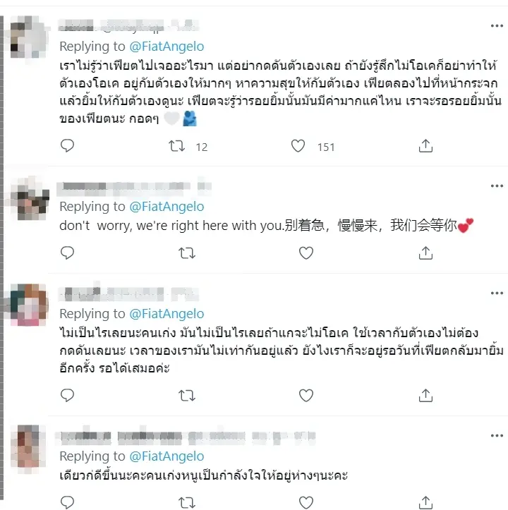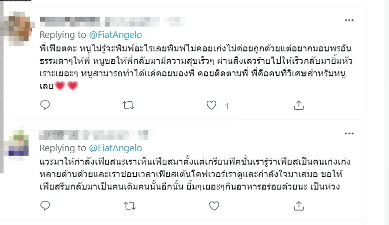 หลังจากนั้นไม่นานเหล่าบรรดาแฟนคลับไทย และต่างประเทศต่างเข้ามาร่วมกำลังใจถึงเฟียตกันอย่างอบอุ่น พร้อมอวยพรให้นักแสดงหนุ่มผ่านพ้นกับอุปสรรคไปให้ได้โดยเร็ว
