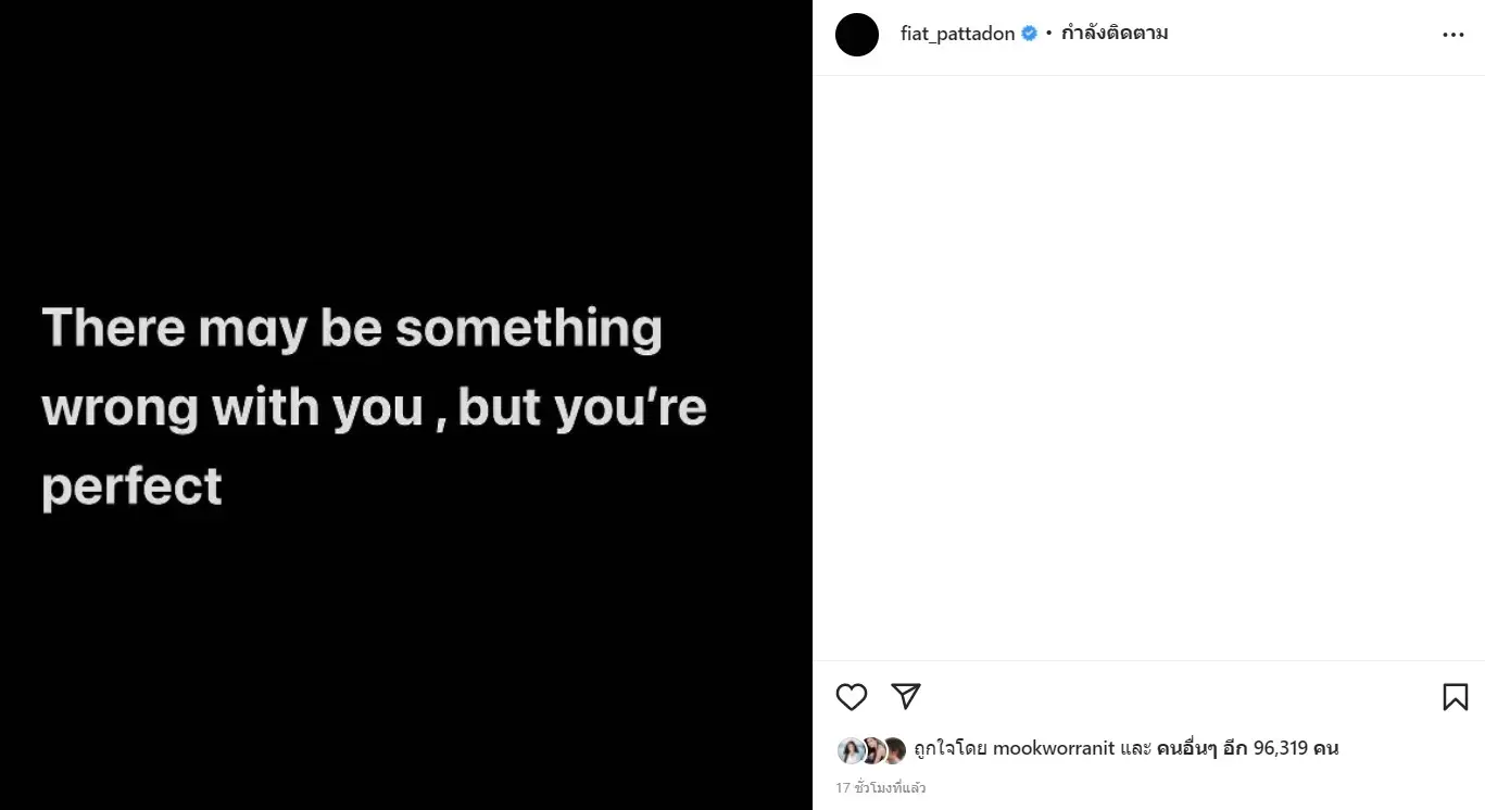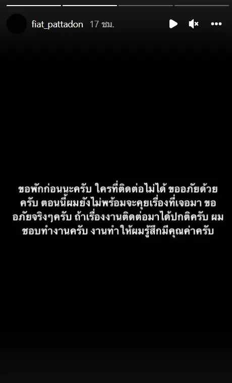 ในขณะที่สตอรี่ไอจีได้โพสต์ว่า “ขอพักก่อนนะครับ ใครที่ติดต่อไม่ได้ ขออภัยด้วยครับ ตอนนี้ผมยังไม่พร้อมจะคุยเรื่องที่เจอมา ขออภัยจริงๆครับ ถ้าเรื่องงานติดต่อมาได้ปกติครับ ผมชอบทำงานครับ งานทำให้ผมรู้สึกมีคุณค่าครับ” ซึ่งทั้งหมดก็ยังไม่ทราบสาเหตุที่เจ้าตัวไปเจอเรื่องอะไรมา อย่างไรคงต้องรอเจ้าตัวออกมาชี้แจงอีกครั้งเมื่อสภาพจิตใจเริ่มดีขึ้น