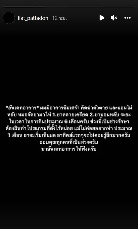 ล่าสุด เฟียต ได้ออกมาอัปเดตอาการและยอมรับว่าเป็นโรคซึมเศร้า โดยข้อความที่ เฟียต โพสต์คือ “อัพเดทอาการ ผมมีอาการซึมเศร้า คิดฆ่าตัวตาย และนอนไม่หลับ หมอจัดยามาให้ 1.ยาคลายเครียด 2.ยานอนหลับ ระยะเวลาในการกินประมาณ 6 เดือนครับ ช่วงนี้เป็นช่วงรักษา ต้องฝืนทำโปรแกรมที่ตั้งไว้หน่อย แม้ไม่ค่อยอยากทำ ประมาณ 1 เดือน ยาจะเริ่มเห็นผล อาทิตย์แรกจะไม่ค่อยรู้สึกมากครับ ขอบคุณทุกคนที่เป็นห่วงครับ มาอัพเดทอาการให้ฟังครับ“