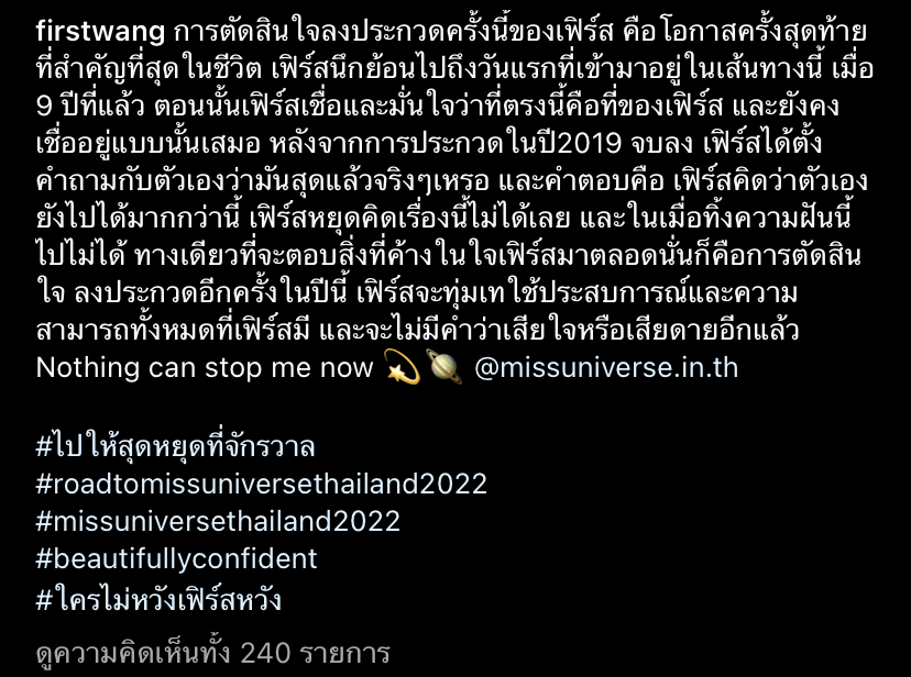 และล่าสุดเฟิร์ส หวังก็ได้ออกเปิดเผยถึงเหตุผลในการตัดสินใจลงประกวดในครั้งนี้หลังจากที่ห่างหายไปนานกว่า 2 ปี ว่าการลงงแข่งขันในครั้งนี้ถือว่าเป็นโอกาสสุดท้ายครั้งสำคัญในชีวิตแล้ว ตลอดระยะเวลาที่เข้ามาในวงการนางงาม เจ้าตัวเชื่อและมั่นใจตลอดว่า “ที่ตรงนั้นคือที่ของเฟิร์ส” และยังเชื่อยู่แบบนั้นเสมอ หลังจากจบการแข่งขั้นในปี2019 ก็กลับมานั่งคิดกับตัวเองว่า “มันสุดแล้วจริง ๆ หรอ”