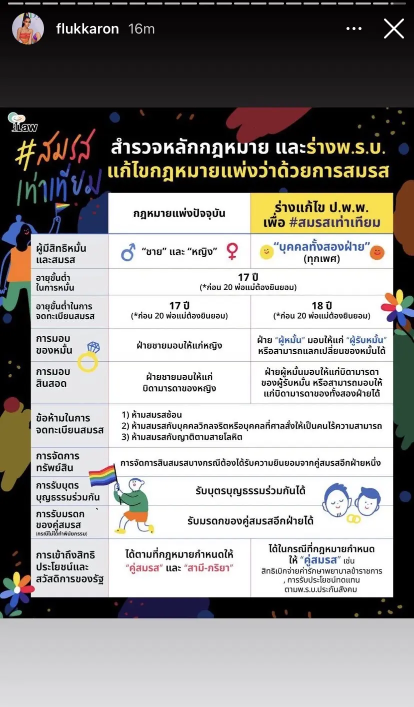 ไม่เพียงเท่านี้ เธอยังได้มีการแชร์ข้อมูลข่าวสารเกี่ยวกับการสำรวจหลักกฎหมาย และร่างพ.ร.บ.แก้ไขกฎหมายแพ่งว่าด้วยการสมรส ที่เทียบกันให้เห็นอย่างชัดเจนว่า กฎหมายแพ่งปัจจุบัน และ ร่างแก้ไข ป.พ.พ. เพื่อ #สมรสเท่าเทียม เป็นอย่างไร