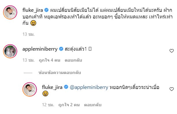 แต่ล่าสุดไม่รู้ไปยังไง มายังไง หนุ่มฟลุค โพสต์แคปชั่นแรงลงบนไอจีงานนี้ภรรยาโผล่คอมเมนต์ทันที โดยเจ้าตัวโพสต์ว่า ผมเปลี่ยนนิสัยเมียไม่ได้ แต่ผมเปลี่ยนเมียใหม่ได้นะครับ ฝากบอกเค้าที หยุดเอฟรองเท้าได้แล้ว อะหยอกๆ ซื้อให้หมดแหละ เท่าไหร่เท่ากัน 😆 ก่อนที่ แอปเปิ้ล จะเช้ามาคอมเมนต์ว่า สะดุ้งแล้ว1 ด้านฟลุคตอบกลับอีกว่า หยอกนิดๆเดี๋ยวจะน่าเบื่อ 😆 แหม๋…อ่านแวบแรกตกใจหมดเลยจ้าพ่อ