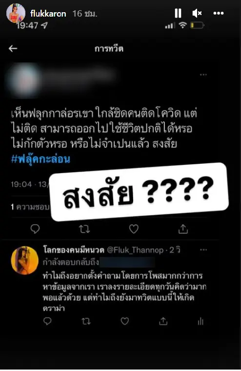 ล่าสุด มีผู้ใช้งานทวิตเตอร์รายหนึ่งได้โพสต์ข้อความเป็นเชิงตั้งคำถามว่า ‘เห็นฟลุกกาล่อรเขาใกล้ชิดคนติดโควิด แต่ไม่ติด สามารถออกไปใช้ชีวิตปกติได้หรอ หรือไม่จำเป็นแล้ว สงสัย’