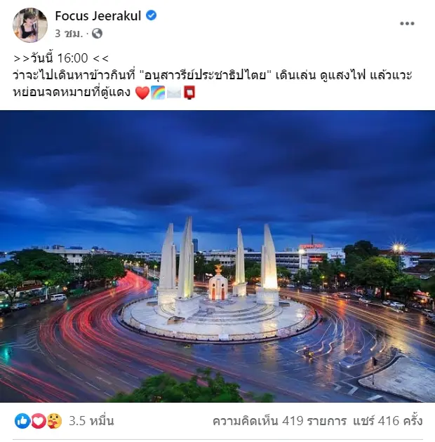 เรียกได้ว่าอิ่มเเน่ๆค่าาาาสำหรับนักแสดงสาวอย่าง โฟกัส จีระกุล ที่ออกมาโพสต์ความสวยงามของ อนุสาวรีย์ประชาธิปไตย พร้อมกับแสงไฟสวยๆในยามเย็นที่บอกได้เลยว่า สวยงามในยามเย็นจริงๆค่าาา โดยเจ้าตัวได้ออกมาบอก พร้อมกับเชิญชวนให้เหล่าบรรดาแฟนคลับ ไปนั่งทานข้าวชิวๆพร้อมกัน ณ. อนุสาวรีย์ประชาธิปไตย วันนี้ (8-11-63) เวลา 16.00 น. โดยประมาณ งานนี้นอกจากจะชวนไปทานข้าว เดินเล่น ดูแสงไฟ เจ้าตัวก็ไม่ลืมที่จะบอกว่า “แวะหย่อนจดหมายที่ตู้แดงด้วยนะค่าาา”