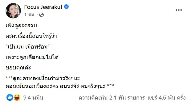 โฟกัส จีระกุล ฟาดประโยคเด็ดกลางแฟนเพจ ละครเรื่องนี้สอนให้รู้ว่า ‘เป็นแม่ เมื่อพร้อม’ ทำเอาชาวเน็ตแห่คอมเมนต์และแชร์ออกไปเป็นจำนวนมาก