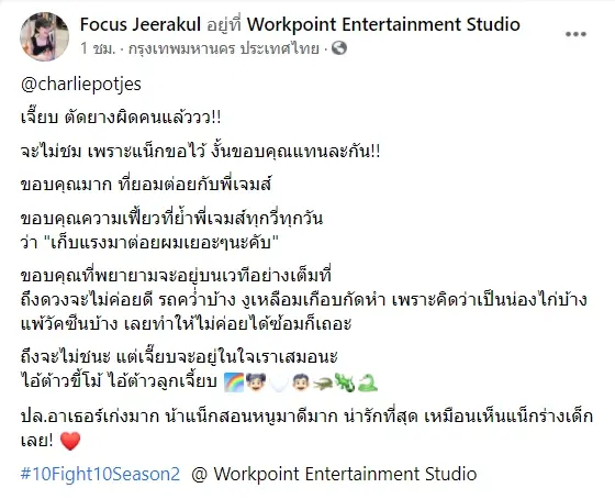 งานนี้แม้ว่ามวยจะจบ แต่ความประทับใจคงไม่จบง่ายๆ โดยสาวโฟกัสได้มาโพสต์คำขอบคุณถึงแน็กแบบจัดหนักจัดเต็มลงเฟซบุ็กของตัวเอง ความว่า “@charliepotjesเจี๊ยบ ตัดยางผิดคนแล้ววว!!จะไม่ชม เพราะแน็กขอไว้ งั้นขอบคุณแทนละกัน!!ขอบคุณมาก ที่ยอมต่อยกับพี่เจมส์ ขอบคุณความเฟี้ยวที่ย้ำพี่เจมส์ทุกวี่ทุกวัน ว่า “เก็บแรงมาต่อยผมเยอะๆนะคับ”ขอบคุณที่พยายามจะอยู่บนเวทีอย่างเต็มที่ ถึงดวงจะไม่ค่อยดี รถคว่ำบ้าง งูเหลือมเกือบกัดหำ เพราะคิดว่าเป็นน่องไก่บ้าง แพ้วัคซีนบ้าง เลยทำให้ไม่ค่อยได้ซ้อมก็เถอะ ถึงจะไม่ชนะ แต่เจี๊ยบจะอยู่ในใจเราเสมอนะ ไอ้ต้าวขี้โม้ ไอ้ต้าวลูกเจี้ยบ ![]()