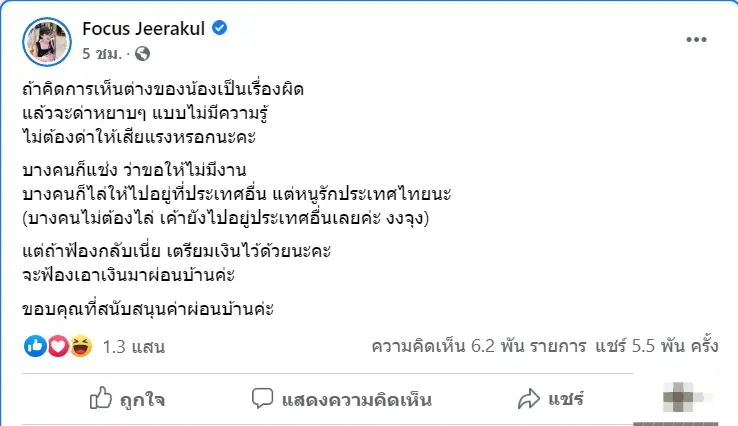 โดยก่อนหน้านี้ โฟกัสยังได้โพสต์แบบติดตลกเอาไว้ว่า ถ้าไม่มีเงินไม่มีงาน ได้โปรดสนับสนุนกันต่อไปด้วย และต่อมา โฟกัสก็ได้ออกมาโพสต์อีกครั้งนึงเรื่องที่ได้มีคนเข้ามาคอมเมนต์ด่าแบบหยาบคาย โดยเธอระบุว่า