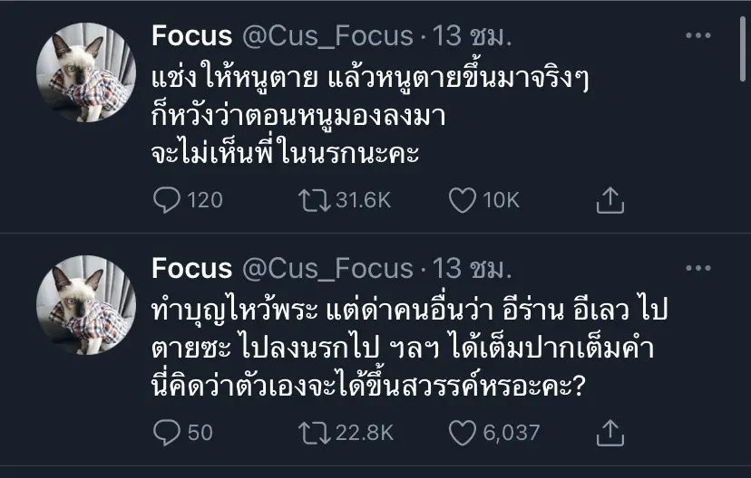 และ ได้มีการโพสต์ในทวิตเตอร์ด้วยข้อความว่า “ทำบุญไหว้พระ แต่ด่าคนอื่นว่า อีร่าน อีเลว ไปตายซะ ไปลงนรกไป ฯลฯ ได้เต็มปากเต็มคำ นี่คิดว่าตัวเองจะได้ขึ้นสวรรค์หรอคะ?”