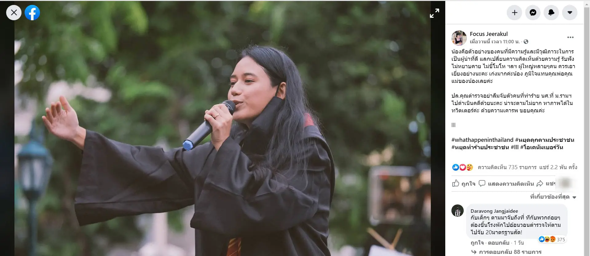 ล่าสุด นักแสดงสาว โฟกัส จีระกุล หนึ่งในนักแสดงที่ออกมาเคลื่อนไหวด้านการเมือง ได้ออกมาโพสต์ข้อความชื่นชม มายด์ ภัสราวลี “น้องคือตัวอย่างของคนที่มีความรู้และมีวุฒิภาวะในการเป็นผู้นำที่ดี แลกเปลี่ยนความคิดเห็นด้วยความรู้ รับฟัง ไม่หยาบคาย ไม่ขี้โมโห ฯลฯ ผู้ใหญ่หลายๆคน ควรเอาเยี่ยงอย่างนะคะ เก่งมากค่ะน้อง ภูมิใจแทนคุณพ่อคุณแม่ของน้องเลยค่ะปล.คุณตำรวจอย่าลืมจับตัวคนที่ทำร้าย นศ.ที่ ม.รามฯ ไปดำเนินคดีด้วยนะคะ น่าจะตามไม่ยาก หาภาพได้ในทวิตเตอร์ค่ะ ด้วยความเคารพ ขอบคุณค่ะ พร้อมข้อความสัญลักษณ์ขีด 3 ขีด” และแฮชแท็ก whathappeninthailand, หยุดคุกคามประชาชน, หยุดทำร้ายประชาชน, lll, โอเคนัมเบอร์วัน