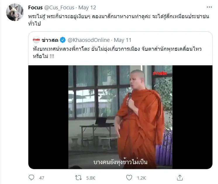 ล่าสุดกับคลิปที่กำลังเป็นกระแสอยู่ในตอนนี้ที่ใครๆต่างก็ให้ความสนใจเป็นอย่างมากเลยทีเดียว ก็คือคลิปหลวงพี่กาโตะพูดถึงการเมือง ซี่งโฟกัสได้มีการแชร์คลิปวิดีโอของหลวงพี่กาโตะที่ได้มีการพูดถึงเรื่องม็อบ การเมือง และในคลิปช่วงหนึ่งได้มีการพูดถึงม็อบ 3 นิ้วว่า หุงข้าวยังไม่เป็นจะไปปฏรูปประเทศแล้ว ทั้งนี้โฟกัสได้รีทวิตคลิปดังกล่าวผ่านทางทวิตเตอร์ พร้อมใส่แคปชั่นสุดเจ็บถ้าใครได้มาอ่านเอาไว้ว่า “พระไม่รู้ พระก็น่าจะอยู่เงียบๆ ลองสึกมาหางานทำดูค่ะ จะได้รู้สึกเหมือนประชาชนทั่วไป”