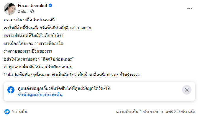 ล่าสุด ทางดาราสาวนักเคลื่อนไหวทางการเมืองชื่อดังอย่าง โฟกัส จิระกุล ก็ได้ออกมาแสดงความคิดเห็นต่อประเด็นนี้ผ่านทางเฟซบุ๊คส่วนตัว ว่า