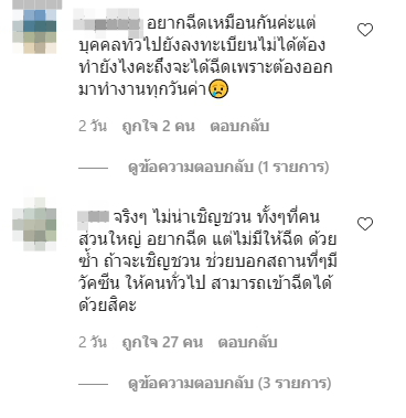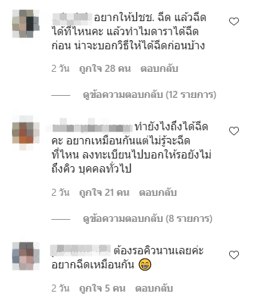 ก่อนที่จะมีคนเข้ามาคอมเมนท์ตั้งคำถามกันมากมาย ว่าทำยังไงถึงได้ฉีดบ้าง และเหตุใดดาราถึงได้ฉีดก่อน เช่น