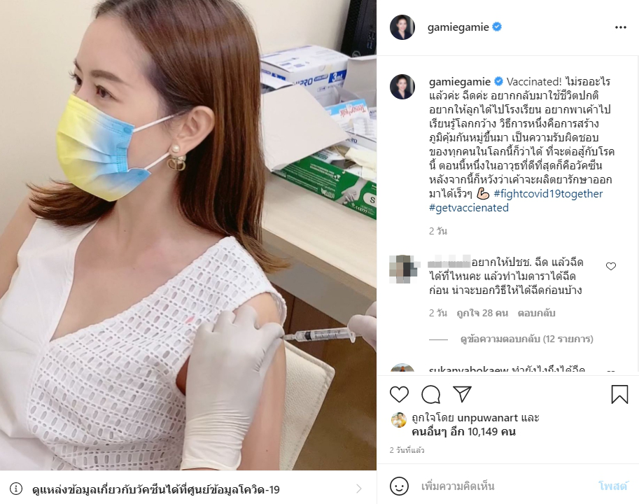 โดยทางเจ้าตัวก็ได้ออกมาโพสต์ภาพขณะฉีดวัคซีนลงในอินสตาแกรม พร้อมแคปชั่นว่า