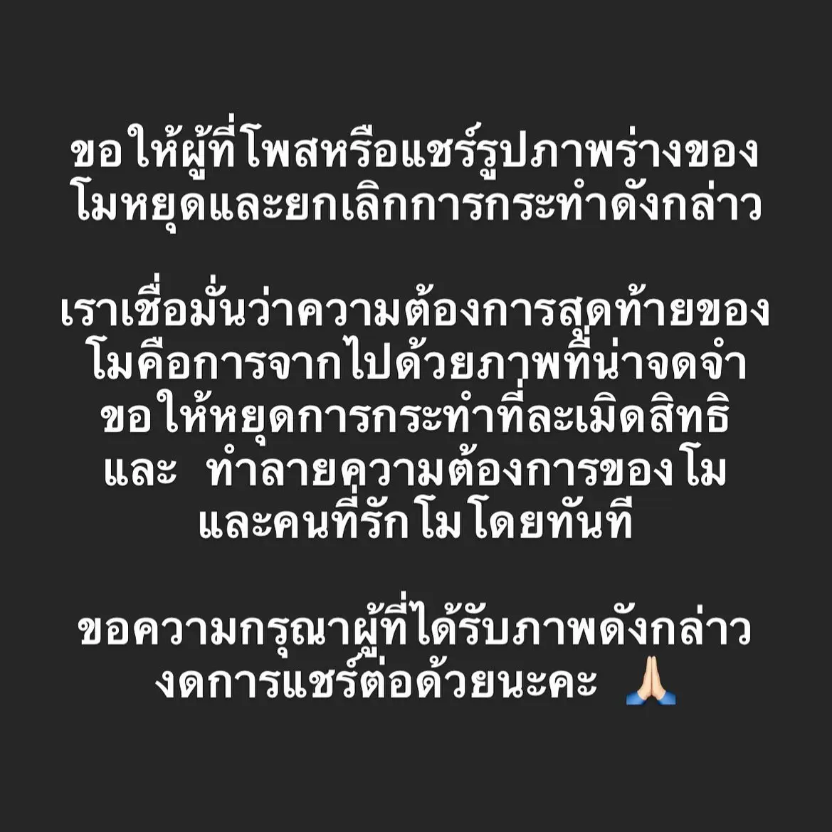 ขอให้ผู้ที่โพสต์หรือแชร์รูปภาพร่างของแตงโมหยุดและยกเลิกการกระทำดังกล่าว เราเชื่อมั่นว่าว่าความต้องการสุดท้ายของโมคือการจากไปด้วยภาพที่น่าจดจำ ขอให้หยุดการกระทำที่ละเมิดสิทธิและ ทำลายความต้องการของโมและคนที่รักโมโดยทันที ขอความกรุณาผู้ที่ได้รับภาพดังกล่าวงดการแชร์ต่อด้วยนะคะ