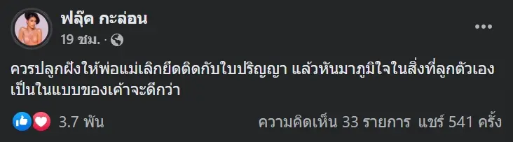 ล่าสุด ฟลุ๊ค กะล่อน ยูทูบเบอร์รุ่นใหม่ได้มีการออกมาแสดงความคิดเห็นว่า ควรปลูกฝังให้พ่อแม่เลิกยึดติดกับใบปริญญา แล้วหันมาภูมิใจในสิ่งที่ลูกตัวเองเป็นในแบบของเค้าจะดีกว่า ทำเอาบรรดาแฟนๆผู้ติดตามต่างแสดงความคิดเห็นเป็นจำนวนมาก แล้วคุณล่ะ มีความคิดเห็นต่อเรื่องนี้อย่างไร?