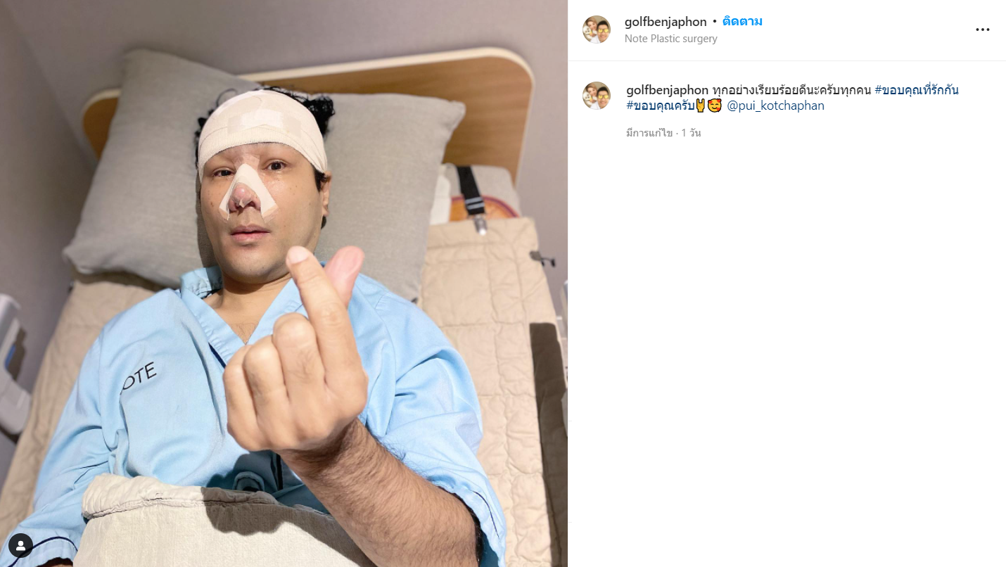 ล่าสุด กอล์ฟ เบญจพล ก็ได้โพสต์รูปหลังการผ่าตัดพร้อมชูมินิฮาร์ตให้แฟน ๆ ได้หายห่วง โดยเจ้าตัวได้เขียนคำบรรยายประกอบอีกด้วยว่า “ทุกอย่างเรียบร้อยดีนะครับทุกคน ขอบคุณที่รักกัน ขอบคุณครับ”