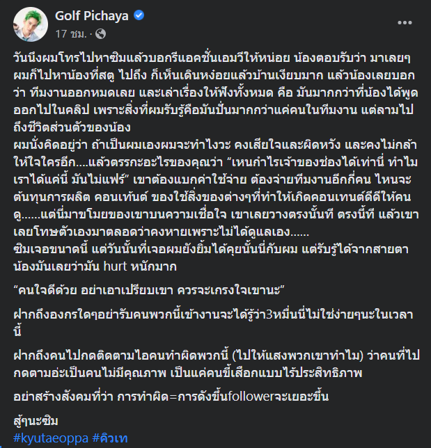 กอล์ฟ พิชญะ เผยมุมมองกรณีดราม่า คิวเท โอปป้า เผย กว่าจะออกมาเป็นคอนเทนต์ดี ๆ ทุกอย่างมีต้นทุน ลั่น หากเกิดขึ้นกับตัวเอง คงไม่กล้าให้ใจใครอีก