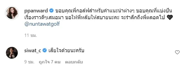 ขอบคุณพี่กอล์ฟสำหรับคำแนะนำต่างๆ ขอบคุณที่แบ่งปันเรื่องราวดีๆเสมอมา ขอให้พี่หลับให้สบายนะคะ จะรำลึกถึงพี่ตลอดไป ทั้งนี้ด้าน ซี ศิวัฒน์ ก็เข้ามาคอมเมนต์ร่วมไว้อาลัยอีกว่า เสียใจด้วยนะครับ