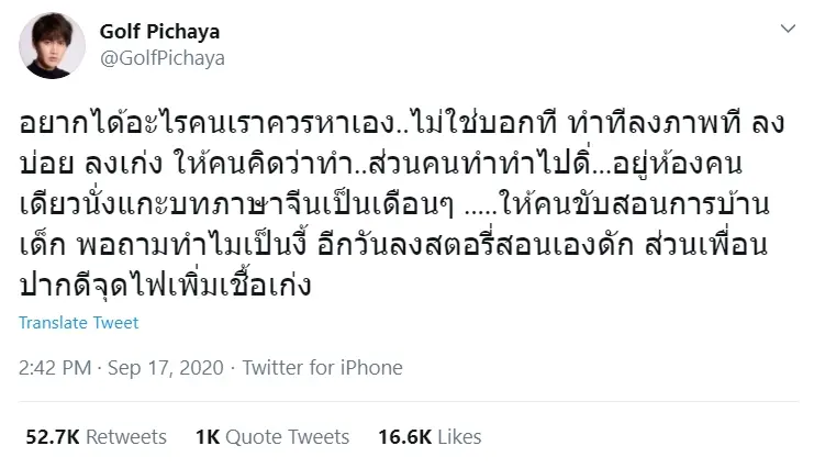 ล่าสุดด้าน กอล์ฟ พิชญะ ออกมาแฉยับ ว่าซาร่านั้นมีพฤติกรรมอย่างไร โดยโพสต์ฉุนร่ายยาวผ่านอินสตาแกรมว่า “อยากได้อะไรคนเราควรหาเอง..ไม่ใช่บอกที ทำทีลงภาพที ลงบ่อย ลงเก่ง ให้คนคิดว่าทำ..ส่วนคนทำทำไปดิ่…อยู่ห้องคนเดียวนั่งแกะบทภาษาจีนเป็นเดือนๆ …..ให้คนขับสอนการบ้านเด็ก พอถามทำไมเป็นงี้ อีกวันลงสตอรี่สอนเองดัก ส่วนเพื่อนปากดีจุดไฟเพิ่มเชื้อเก่ง”