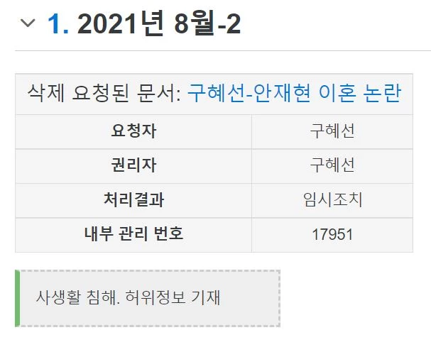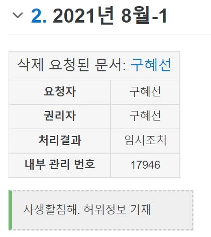 เป็นการละเมิดความเป็นส่วนตัวและเผยแพร่ข้อมูลเท็จ เธอได้ขอให้ลบข้อมูล ดังนั้นเพจจึงถูกเปลี่ยนเป็นส่วนตัว และได้ระงับไว้ชั่วคราว โดย feature นี้มีให้ใน Namu Wiki เพื่อป้องกันการเผยแพร่บทความที่มีการหมิ่นประมาทหรือการเปิดเผยข้อมูลส่วนบุคคล เนื่องจาก Namu Wiki เป็นเว็บไซต์ Wiki ออนไลน์ที่คล้ายกับ Wikipedia ที่ทำงานในลักษณะที่ผู้ใช้ได้รับอนุญาตให้สร้างและแก้ไขหน้าข้อมูลด้วยตนเอง นี่ไม่ใช่ครั้งแรกที่บุคคลที่มีชื่อเสียงหรือผู้มีชื่อเสียงร้องขอให้ Namu Wiki แก้ไขหรือลบหน้าข้อมูล