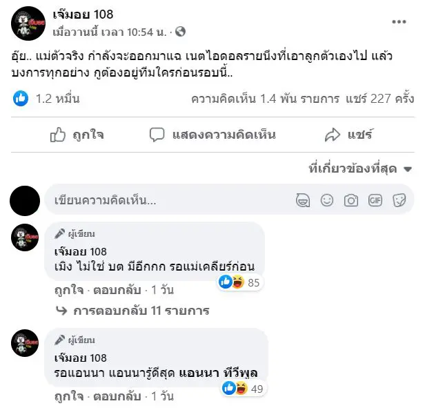 เพจดังเจ๊มอย108 ออกมาทิ้งปริศนา แม่ตัวจริง เตรียมแฉเน็ตไอดอลเอาลูกไป พร้อมชี้เป้าคนรู้เรื่องคือ แอนนา ทีวีพูล