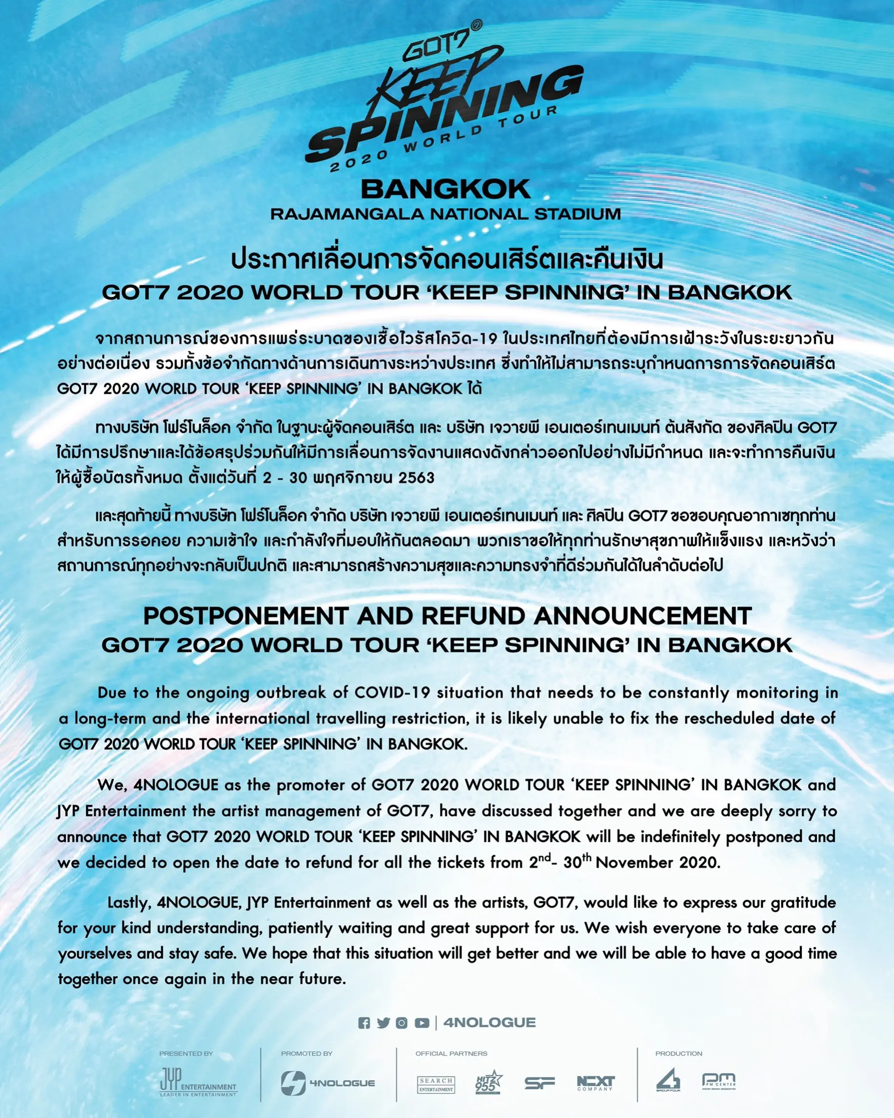 ทางบริษัท โฟร์โนล็อค จำกัด ในฐานะผู้จัดคอนเสิร์ต และ บริษัท เจวายพี เอนเตอร์เทนเมนท์ ต้นสังกัดของศิลปิน GOT7 ได้มีการปรึกษาและได้ข้อสรุปร่วมกันให้มีการเลื่อนการจัดงานแสดงดังกล่าวออกไปอย่างไม่มีกำหนด และจะทำการคืนเงินให้ผู้ซื้อบัตรทั้งหมด ตั้งแต่วันที่ 2 – 30 พฤศจิกายน 2563