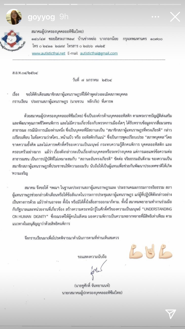 “ด้วยสมาคมผู้ปกครองบุคคลออทิชีม(ไทย) ซึ่งเป็นองค์กรด้านบุคคลออทิสติก ตามพระราชบัญญัติส่งเสริม และพัฒนาคุณภาพชีวิตคนพิการ และไม่มีความเกี่ยวข้องกับพรรคการเมืองใดๆ ได้รับทราบข้อมูลจากสื่อมวลชนสาธารณะ กรณีนักการเมืองคนหนึ่ง ซึ่งเป็นบุคคลที่มีสถานะเป็น “สมาชิกสภาผู้แทนราษฎรที่ทรงเกียรติ” กล่าวเปรียบเทียบ ในข้อความว่#ไร…น้าแบ้ว หรือ ออทิสติกกันแน่” ซึ่งเป็นการพูดเปรียบเปรย “สภาพบุคคล”โดยขาดความยังคิด และไม่เคารพศักดิ์ศรีของความเป็นมนุษย์ กระทบความรู้สึกคนพิการ บุคคลออทิสติก และครอบครัวอย่งมาก แม้ว่า เรื่องดังกล่วจะเป็นเรื่องส่วนบุคคลหรือระหว่างบุคคล แต่การเผยแพร่ข้อความต่อสาธารณชน เป็นการปฏิบัติที่ไม่หมาะสมกับ “สถานะอันทรงเกียรติ” ขัดต่อ จริยธรรมอันดีงาม ของความเป็นสมาชิกสภาผู้แทนราษฎรที่ประชาชนให้ความยอมรับ นับถือให้เป็นผู้แทนเพื่อช่วยกันพัฒนาประเทศชาติให้เกิดความเจริญ