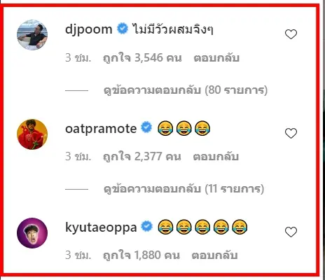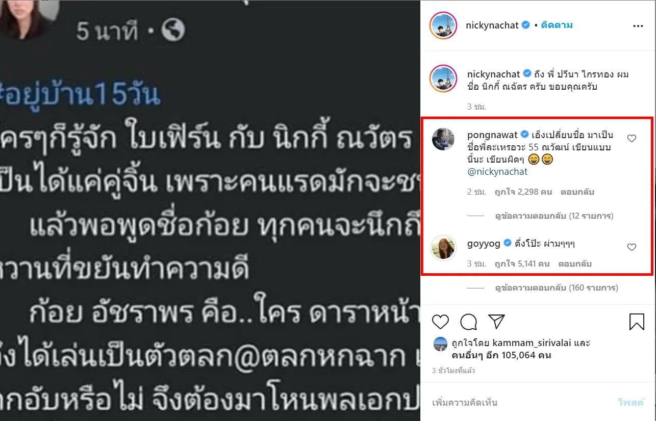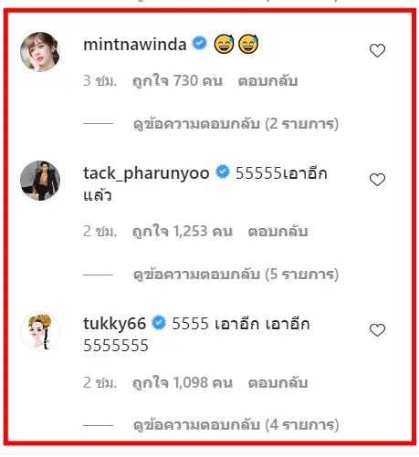 ทั้งนี้เหล่าเพื่อนๆร่วมวงการบันเทิงต่างก็พากันไปถล่มคอมเมนต์กันอย่างมากมาย รวมถึงสาวก้อยที่เข้าไปคอมเมนต์ต่อมุกของหนุ่มนิกกี้ว่า “ตึ่งโป๊ะ ผ่ามๆๆๆ ” และทุกคนต่างก็พากันหัวเราะให้กับความตลกของนิกกี้ ที่ออกมาโพสต์ข้อความชวนฮาแบบนี้อีกด้วย
