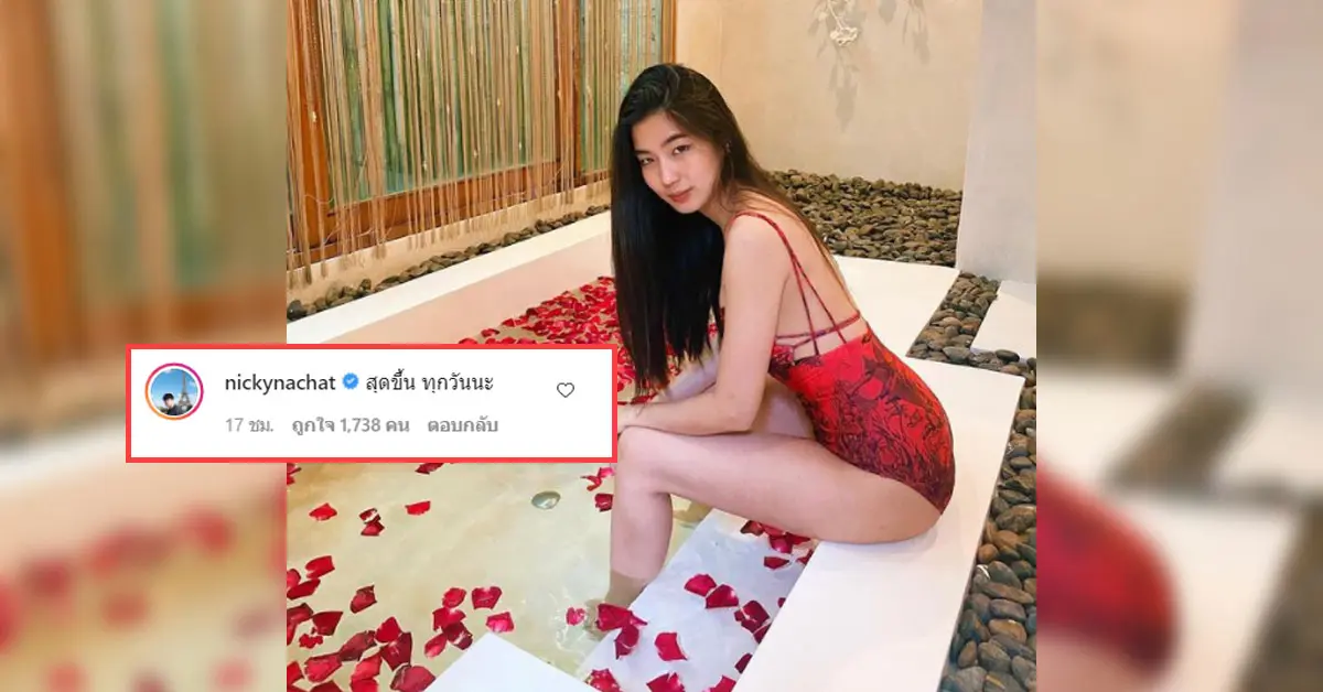 โดยล่าสุด สาวก้อยก็ได้อัปโหลดรูปผ่านทางอินสตาแกรมส่วนตัว เป็นภาพใส่ชุดรัดรูปสีแดง ขาแช่อยู่ในอ่างอาบน้ำมีกลีบกุหลาบโรยอยู่ ก่อนที่หวานใจ หรือหนุ่มนิกกี้จะโผล่คอมเมนท์แซวว่า “สุดขึ้น ทุกวันนะ”