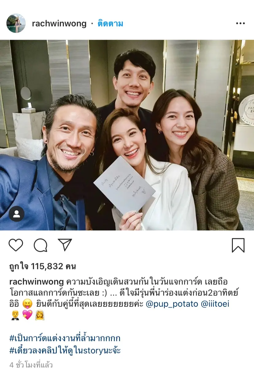 โดยเมื่อล่าสุด วันที่ 20 ต.ค. 63 โดยงานนี้ ทั้ง 4 คน ได้มีโอกาสบังเอิญเจอกันในระหว่างที่กำลังแจกการ์ดเชิญ พวกเขาจึงได้ใช้โอกาสนี้ในการแลกการ์ดกันซะเลย โดยสาวก้อย ได้เก็บภาพและยังได้นำมาโพสต์ลงบนอินสตาแกรม ระบุว่า “ความบังเอิญเดินสวนกันในวันแจกการ์ด เลยถือโอกาสแลกการ์ดกันซะเลย 🙂 … ดีใจมีรุ่นพี่นำร่องแต่งก่อน2อาทิตย์ อิอิ ? ยินดีกับคู่นี้ที่สุดเลยยยยยยยค่ะ”