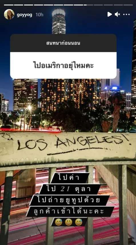 งานนี้ ก้อย ได้ออกมาตอบแฟนคลับคนดังกล่าวว่า ไปค่ะ ไป 21 ตุลาคม ไปถ่ายยูทูบด้วย พร้อมโพสต์รูปพื้นหลังที่เขียนไว้ว่า LOS ANGELES! เหมือนใบ้เป็นนัยๆว่า เธออาจจะไปบินไปเที่ยวที่ LA ก็เป็นได้!