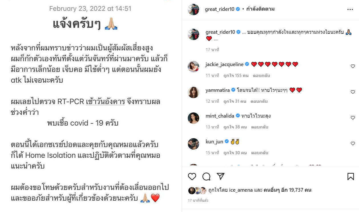 ล่าสุดพระเอกหนุ่ม เกรท วรินทร ที่ปรากฎร่วมเฟรมถ่ายภาพในงานดังกล่าวก็ออกมาประกาศพบเชื้อโควิด19 เช่นกัน โดยเจ้าตัวโพสต์แจ้งข่าวผ่านไอจีส่วนตัว พร้อมแคปชั่นว่า ขอบคุณทุกๆกำลังใจและทุกๆความห่วงใยนะครับ