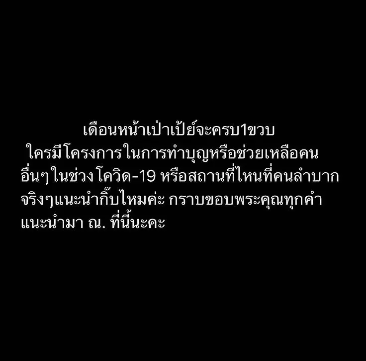 รวมถึง กุ๊บกิ๊บ สุมณทิพย์ คุณแม่ลูก 2 คนสวย ที่ได้มีการประกาศผ่านอินสตาแกรมว่า “เดือนหน้าเป่าเป้ย์จะครบ 1 ขวบ ใครมีโครงการในการทำบุญหรือช่วยเหลือคนอื่นๆในช่วงโควิด-19 หรือสถานที่ไหนที่คนลำบากจริงๆแนะนำกิ๊บไหมค่ะ กราบขอบพระคุณทุกคำแนะนำมา ณ. ที่นี้นะคะ”