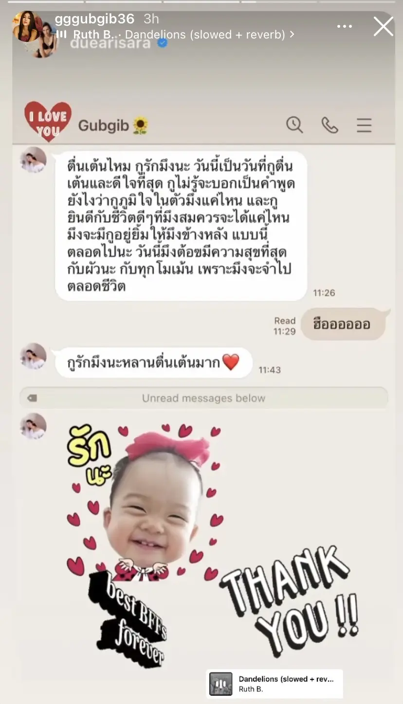 แต่แล้วดูเหมือนว่าทำเอาหลายๆคนไขข้อข้องใจไปพร้อมกับการแสดงความยินดีๆไปตามๆกัน หลังจากที่ เจ๊มอย 108 ได้มีการโพสต์อีกหนึ่งเบาะแส นั่นก็คือ แชทที่ กุ๊บกิ๊บ แสดงความยินดีกับ ดิว อริสรา แต่ทั้งนี้ทั้งนั้นก็ต้องมารอลุ้นกันต่อไปอีกตามเคยว่าสรุปจะท้องจริงหรือไม่?
