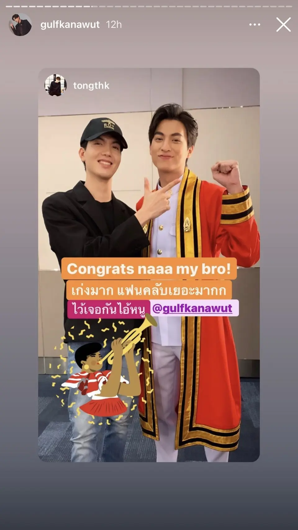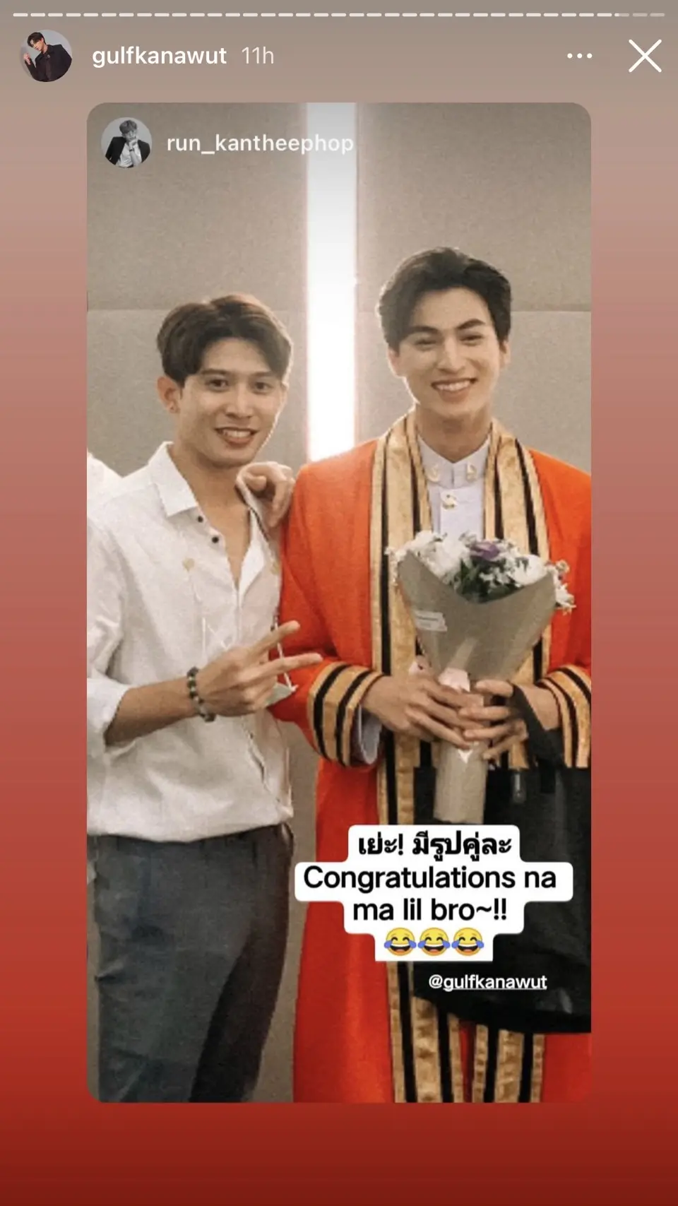 หลังจากที่เหล่าแฟนคลับได้ร่วมแสดงความยินดีอย่างล้นหลามผ่านทางแฮชแท็ก #ConGULFtulations ให้ได้เห็นความรักท่วมท้น ถึงเวลาของการประมวลภาพเริ่ดๆของ กลัฟ และผองเพื่อนที่น่ารัก เป็นการเปิดคลังแสงความประทับใจผ่านทางสตอรี่อินสตาแกรมส่วนตัว เปิดลุคบัณฑิตคณะครุศาสตร์อุตสาหกรรมและเทคโนโลยี ภาควิชาเทคโนโลยีและสื่อสารการศึกษา มหาวิทยาลัยเทคโนโลยีพระจอมเกล้าธนบุรี ว่าครุยสีแดงนั้นแรงฤทธิ์แค่ไหน กระแทกใจแฟนคลับสุดๆไปเลยจ้างานนี้ขอบอก!