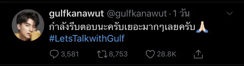 โดยหนุ่มมิวนั้นได้เปิดแท็กพูดคุยในชื่อ #MeAskMew ส่วนหนุ่มกลัฟเปิดแท็กพูดคุยในชื่อ #LetsTalkwithGulf ใช้เวลาไม่นานเหล่าแฟนคลับก็เข้ามาร่วมพูดคุยเป็นจำนวนมาก จนทำให้แฮชแท็กดังกล่าวพุ่งขึ้นสู่ อันดับหนึ่งได้อย่างง่ายดาย