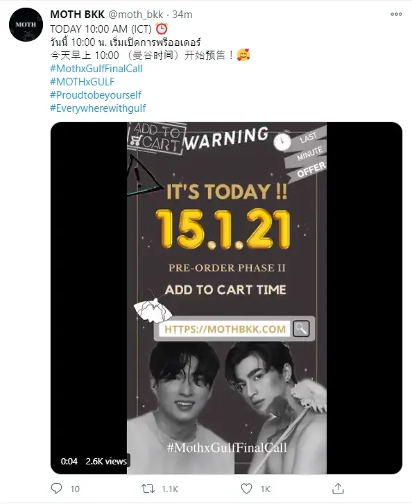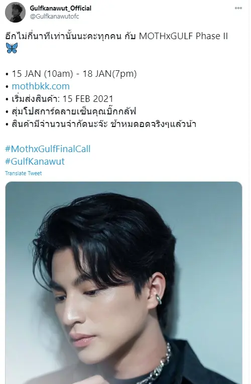 โดย MOTHxGULF Phase II นี้ จะมีเปิดพรีออเดอร์ตั้งแต่วันที่ 15 มกราคม 10.00 น. จนถึงวันที่ 18 มกราคม 19.00 น. ทางเว็บไซต์ mothbkk.com และเริ่มส่งสินค้า 15 กุมภาพันธ์ นี้ นอกจากนี้ ไม่ใช่แค่น้ำหอมเท่านั้น แต่ยังมีการสุ่มลายเซ็นของหนุ่มกลัฟอีกด้วย