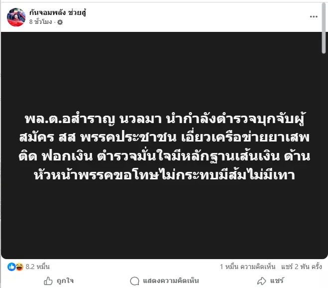 ล่าสุดเมื่อวันที่ 29 ธันวาคม 2568 กัน จอมพลัง ได้ออกมาเคลื่อนไหวผ่านเฟซบุ๊กเพจ “กันจอมพลัง ช่วยสู้” โพสต์ข้อความระบุว่า พล.ต.อสําราญ นวลมา นำกำลังเจ้าหน้าที่เข้าจับกุมผู้สมัคร ส.ส. พรรคประชาชน ที่มีความเชื่อมโยงกับเครือข่ายยาเสพติดและการฟอกเงิน โดยตำรวจมั่นใจว่ามีหลักฐานเส้นทางการเงินชัดเจน