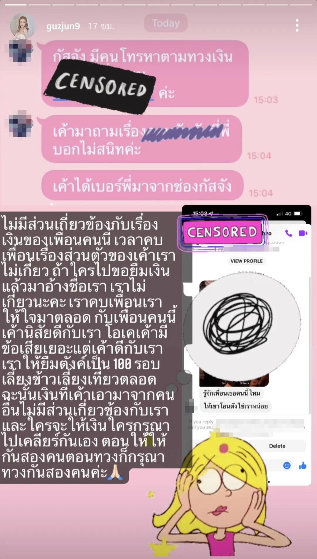 ซึ่งโพสต์ที่เธอออกมาแก้ข่าวนั้น ก็ได้มีการระบุข้อความไว้ว่า ไม่มีส่วนเกี่ยวข้องกับเรื่องเงินของเพื่อนคนนี้ เวลาคบเพื่อนเรื่องส่วนตัวของเขาเราไม่เกี่ยว ถ้าใครไปยืมเงินแล้วมาอ้างชื่อเรา เราไม่เกี่ยวนะคะ เราคบเพื่อนเราให้ใจมาตลอด กับเพื่อนคนนี้เขานิสัยดีกับเรา โอเคเขามีข้อเสียเยอะ แต่เขาดีกับเรา เราให้ยืมตังค์เป็น 100 รอบ เลี้ยงข้าวเที่ยวตลอด