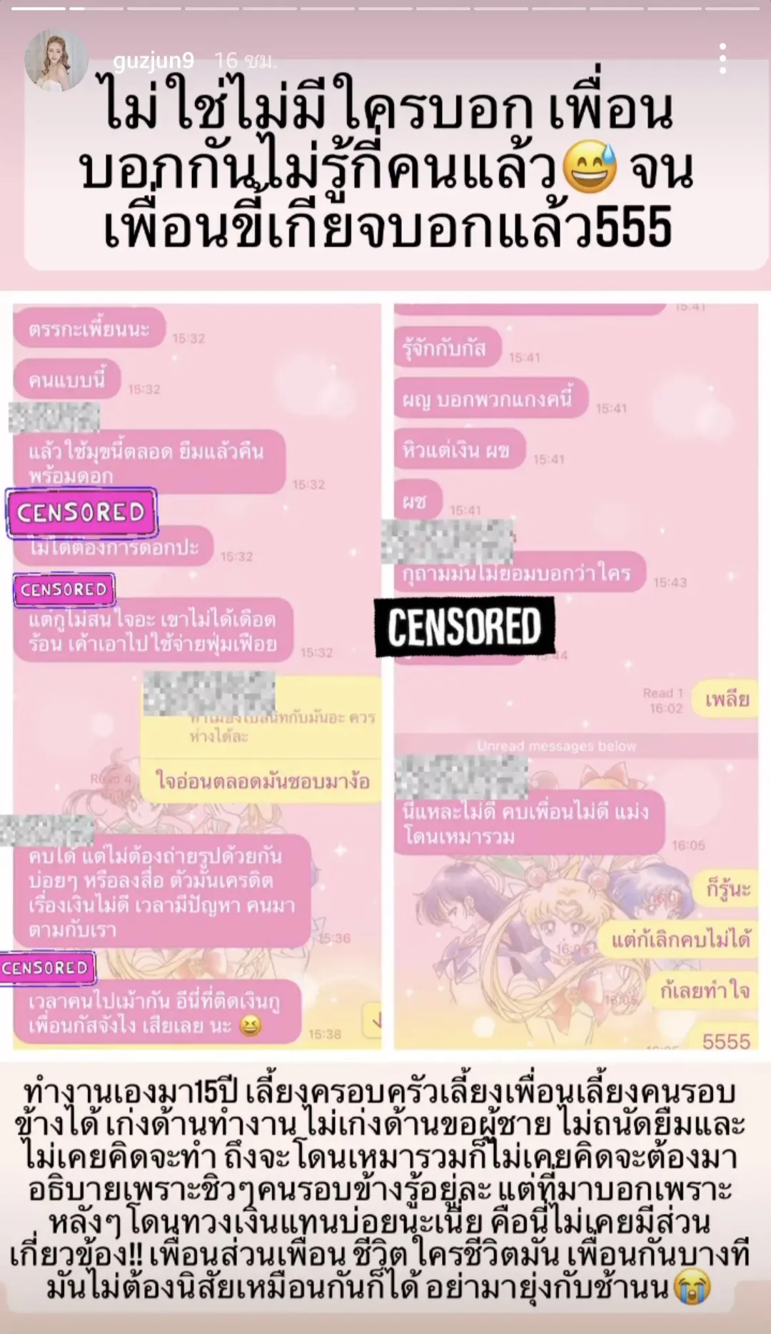 แต่ที่มาบอกเพราะหลังๆ โดนทวงเงินแทนบ่อยนะเนี่ย คือนี่ไม่เคยมีส่วนเกี่ยวข้อง!! เพื่อนส่วนเพื่อน ชีวิตใครชีวิตมัน เพื่อนกันบางทีมันไม่ต้องนิสัยเหมือนกันก็ได้ อย่ามายุ่งกับช้านนน