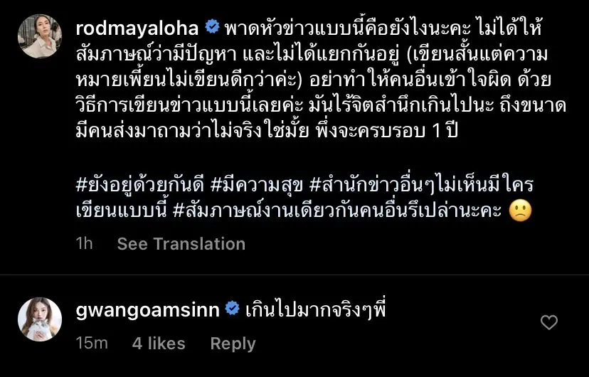 กวาง เดอะเฟซ — จากกรณีที่ รถเมล์ คะนึงนิจ ถึงกับแคปหลักฐานประเด็นข่าวที่ได้มีการเขียนถึงเธอ พร้อมกับระบุข้อความว่า พาดหัวข่าวแบบนี้คือยังไงนะคะ ไม่ได้ให้สัมภาษณ์ว่ามีปัญหา และไม่ได้แยกกันอยู่ (เขียนสั้นแต่ความหมายเพี้ยนไม่เขียนดีกว่าค่ะ)