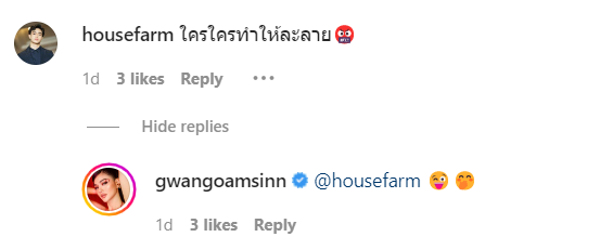ขณะเดียวกันภาพล่าสุดเธอได้ออกมาใส่แคปชั่นว่า เธอมาทำให้ละลาย โดนสาปให้ตายแล้วตายอีก ซึ่งทันทีที่เธอได้ออกมาโพสต์ภาพดังกล่าว ไฮโซเฮ้าส์ แฟนหนุ่มก็ได้เข้ามาคอมเมนต์ในโพสต์ดังกล่าวอีกเช่นกันว่า ใคร ใครทำให้ละลาย