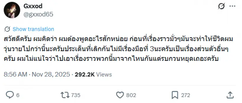 “ประเด็นที่เลิกกันไม่มีเรื่องมือที่ 3 นะครับ เป็นเรื่องส่วนตัวอื่นๆ ครับ…รบกวนหยุดเถอะครับ”