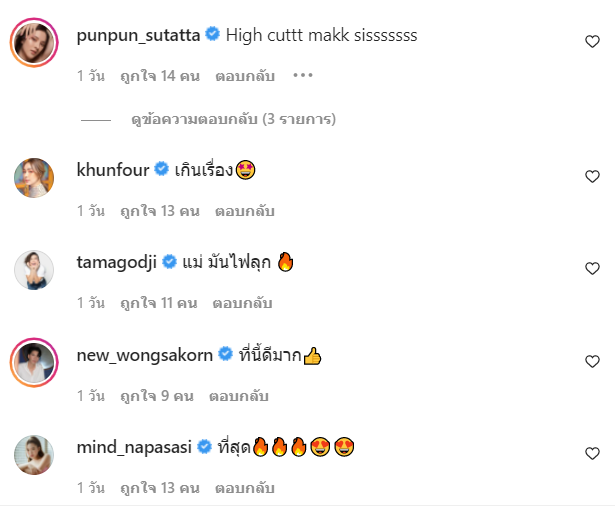 โดยหลังจากที่ กิ๊บซี่ วนิดา ได้โพสต์ภาพดังกล่าวผ่านทางอินสตาแกรมส่วนตัวแล้ว ก็มีเพื่อน ๆ ในวงการบันเทิงเข้ามาคอมเมนต์กันอย่างมากมาย ซึ่งความคิดเห็นที่มีแฟน ๆ กดไลก์มากที่สุดเห็นจะเป็นของนักแสดงสาว ปันปัน สุทัตตา ที่บอกว่า ‘High cut mak sis’ และสาว โฟร์ ศกลรัตน์ ที่แซวเบา ๆ ว่า ‘เกินเรื่อง’ นั่นเอง