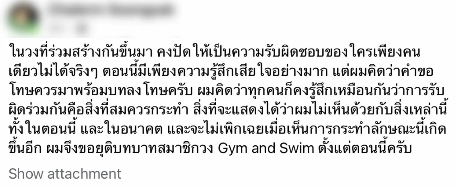 “ผมคิดว่าทุกคนก็คงรู้สึกเหมือนกันว่า การรับผิดร่วมกันคือสิ่งที่สมควรกระทำ สิ่งที่จะแสดงได้ว่าผมไม่เห็นด้วยกับสิ่งเหล่านี้ทั้งในตอนนี้และในอนาคต และจะไม่เพิกเฉยเมื่อเห็นการกระทำลักษณะนี้เกิดขึ้นอีก ผมจึงขอยุติบทบาทสมาชิกวง Gym and Swim ตั้งแต่ตอนนี้ครับ“