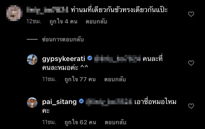 สาวยิปซีจึงไม่อยู่เฉย เข้าไปตอบกลับว่า “คนละที่ คนละหมอค่ะ” ส่วนด้านสาวปาย ก็ยังมีการคอมเม้นท์ต่อว่า “เอาชื่อหมอไหมคะ” บอกเลยงานนี้เล่นกับใครไม่เล่นมาเล่นกับ 2 เพื่อนซี้ถึงที่ ก็ต้องรับฟีดแบคกันให้ได้นะจ๊ะ