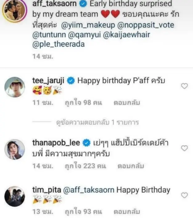 เริ่มจาก ตี๋ ธนพล ที่ได้มีการเข้ามาคอมเมนต์ว่า Happy birthday P’aff ครับ