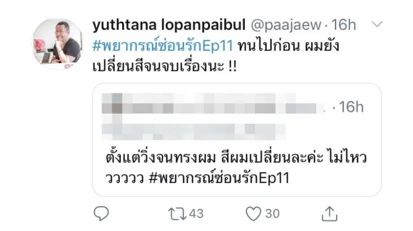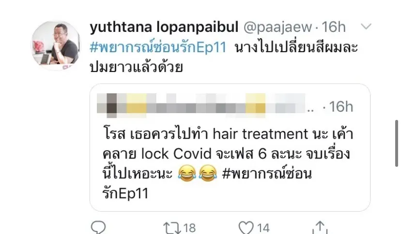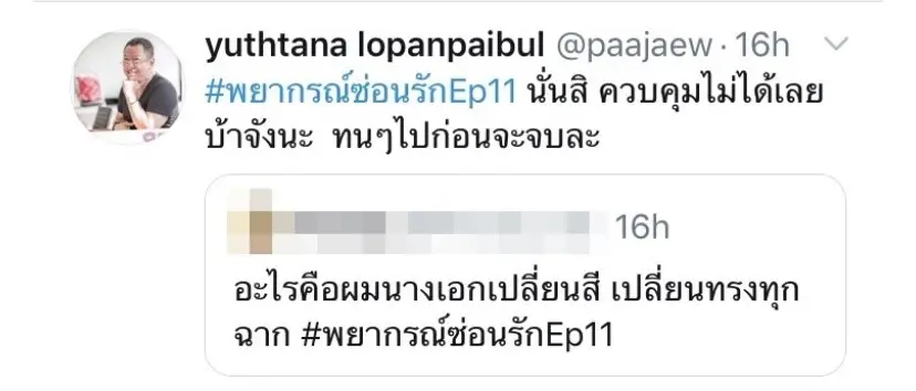 ล่าสุด เกิดดราม่า จากการทวิตของผู้จัดละคร อย่าง ป้าแจ๋ว ยุทธนา ในเรื่องพยากรณ์ซ่อนรัก ที่นำทีมโดยพระนางอย่าง เจมส์ จิรายุ และ ไอซ์ ปรีชญา แต่งานนี้โดนดราม่าในเรื่องของสีผมนางเอกจากขาวเน็ตที่เข้ามาคอมเมนต์กันแบบรัวๆ
