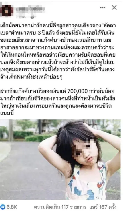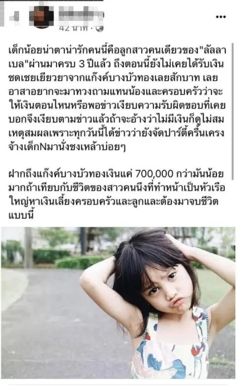 “เด็กน้อยหน้าตาน่ารักคนนี้คือลูกสาวคนเดียวของ “ลัลลาเบล” ผ่านมาครบ 3 ปีแล้ว ถึงตอนนี้ยังไม่เคยได้รับเงินชดเชยเยียวยาจากแก๊งบางบัวทองเลยสักบาท เลยอาสาอยากจะมาทวงถามแทนน้องและครอบครัวว่า จะให้เงินตอนไหนหรือพอข่าวเงียบความรับผิดชอบที่เคยบอกจึงเงียบตามข่าว แล้วถ้าจะอ้างว่าไม่มีเงินก็ดูจะไม่สมเหตุสมผลเพราะทุกวันนี้ได้ข่าวว่ายังจัดปาร์ตี้ครื้นเครง จ้างเด็ก N มานั่งชงเหล้าบ่อยๆ ฝากถึงแก๊งบางบัวทองเงินแค่ 700,000 กว่า มันน้อยมากถ้าเทียบกับชีวิตของสาวคนนึงที่ทำหน้าที่เป็นหัวเรือใหญ่หาเงินเงี้ยงครอบครัวและลูก และต้องมาจบชีวิตแบบนี้”