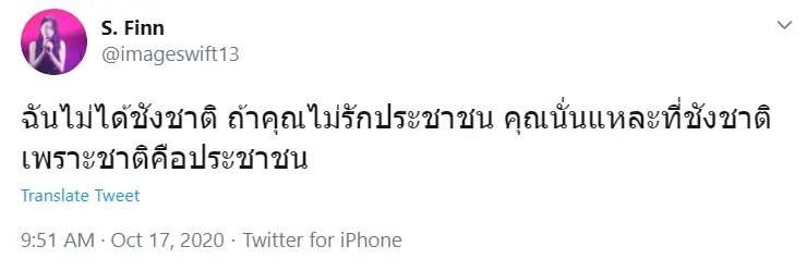 ล่าสุด 17 ตค. 63 นักร้องสาวอย่าง อิมเมจ สุธิตา ออกมโพสต์ข้อความผ่านทวิตเตอร์ส่วนตัวว่า “ฉันไม่ได้ชังชาติ ถ้าคุณไม่รักประชาชน คุณนั่นแหละที่ชังชาติ เพราะชาติคือประชาชน” เรียกได้ว่า ถือเป็นอีกหนึ่งบุคคลบันเทิง ที่ออกมาประกาศจุดยืน อยู่ข้างฝั่งประชาชนผู้รักประชาธิปไตย
